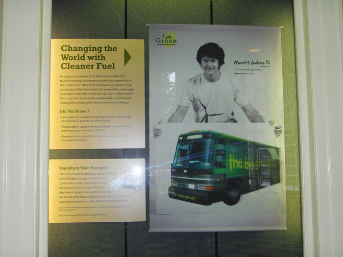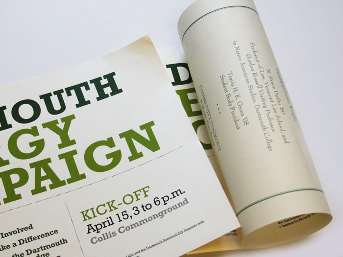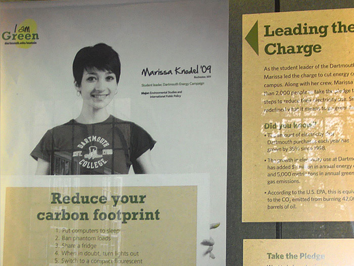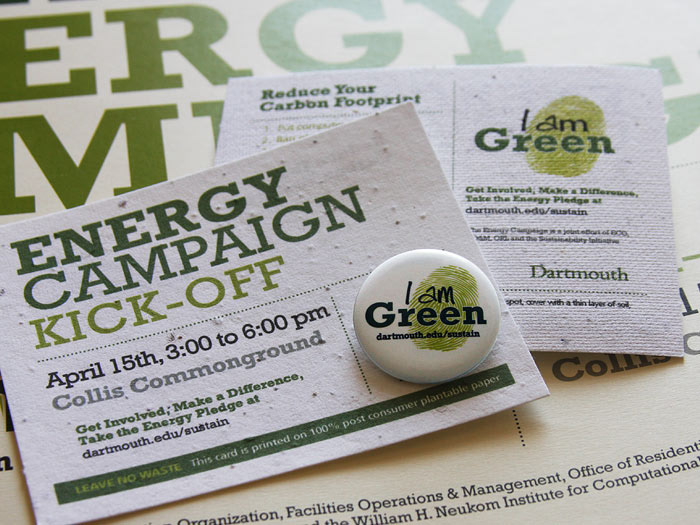 Pledges, practices, and projects were the hallmarks of Dartmouth’s Energy Campaign. The campaign aimed to promote energy conservation by increasing the Dartmouth community’s awareness of their energy consumption and of how to adapt their behaviors to be more environmentally friendly. Seeded postcards, campaign messages printed on the backs of old posters, and an exhibit utilizing recycled cardboard and banners made of recycled soda bottles were the primary methods of communication.